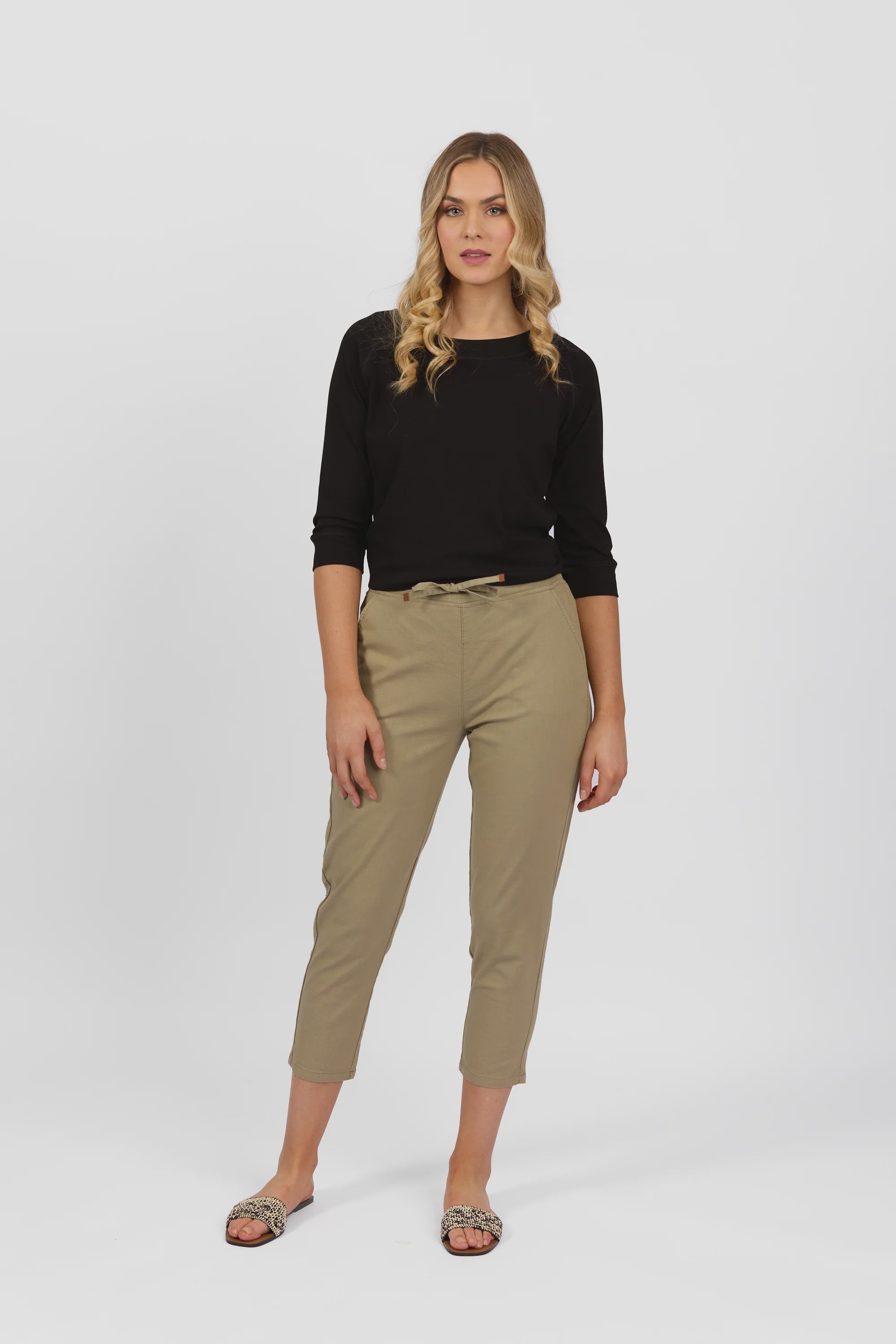 Size GuideMade from soft stretch fabric for easy movement, these 7/8 length slim-leg pants are designed for everyday style. They feature an elastic waistband and a flat front with a drawstring...