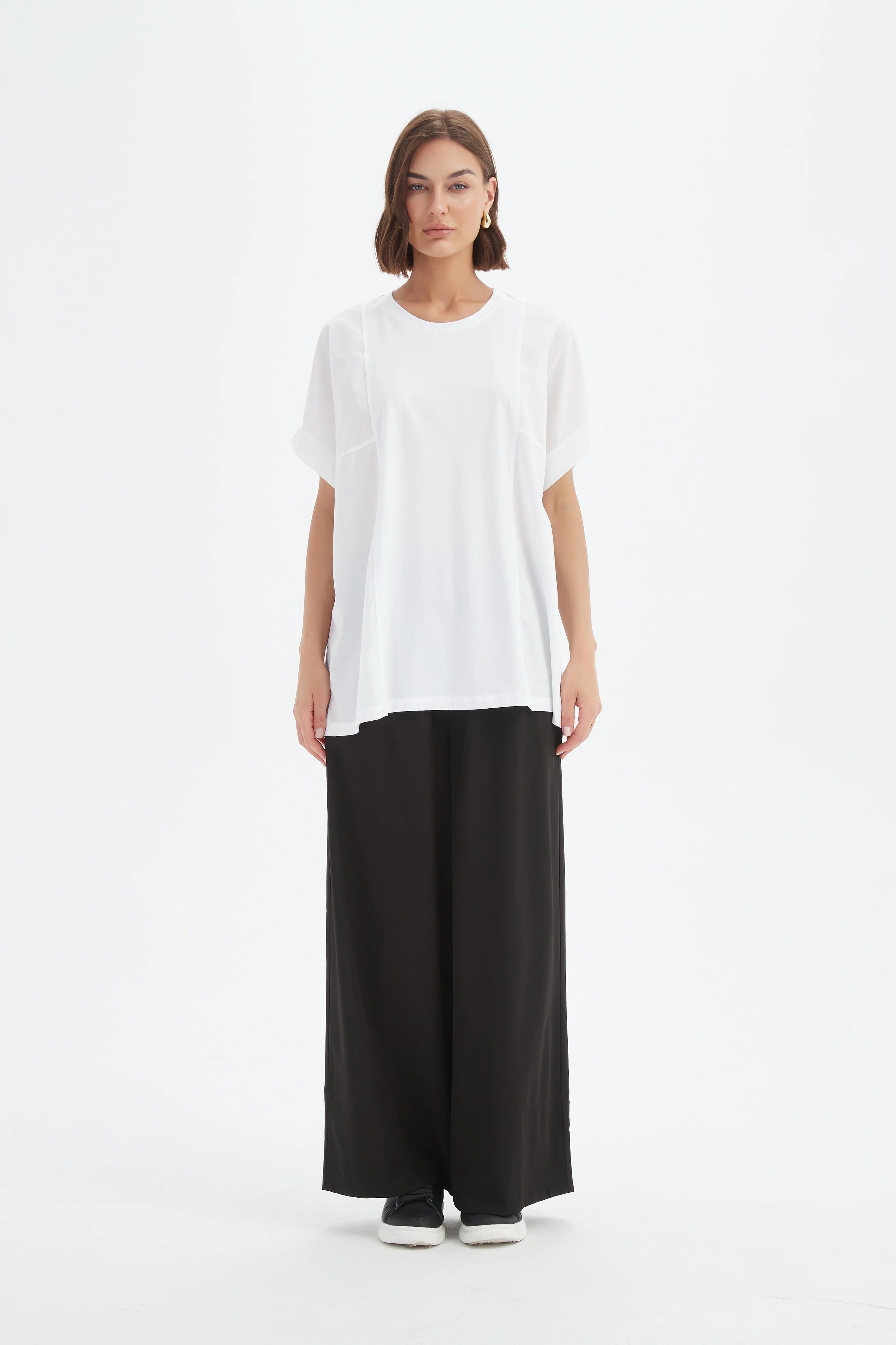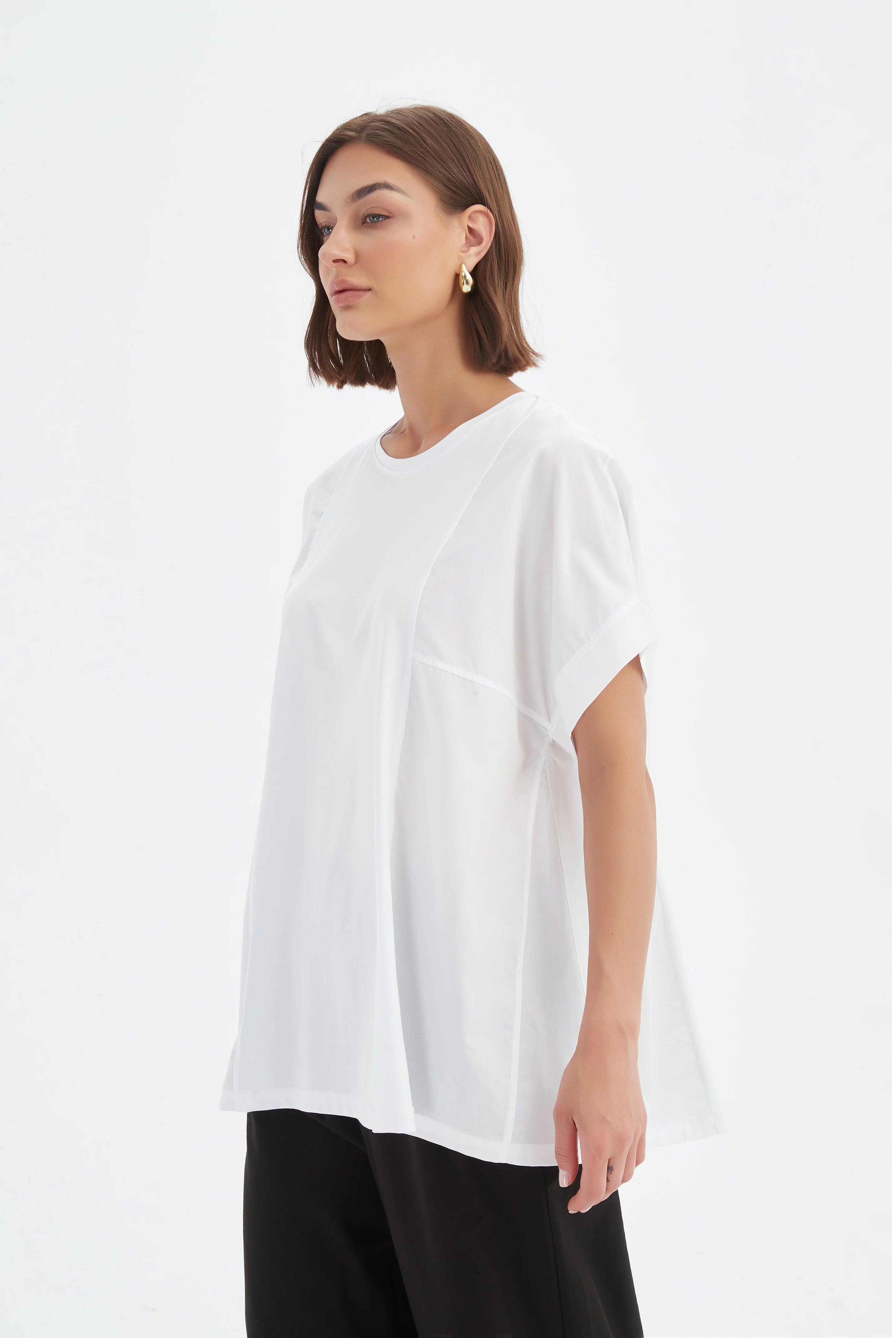 Size GuideEffortless and contemporary, the Boxy Panel Combi Tee combines soft cotton jersey with structured poplin for a relaxed, versatile silhouette. Designed with cuffed short sleeves, side panel inserts, and a...