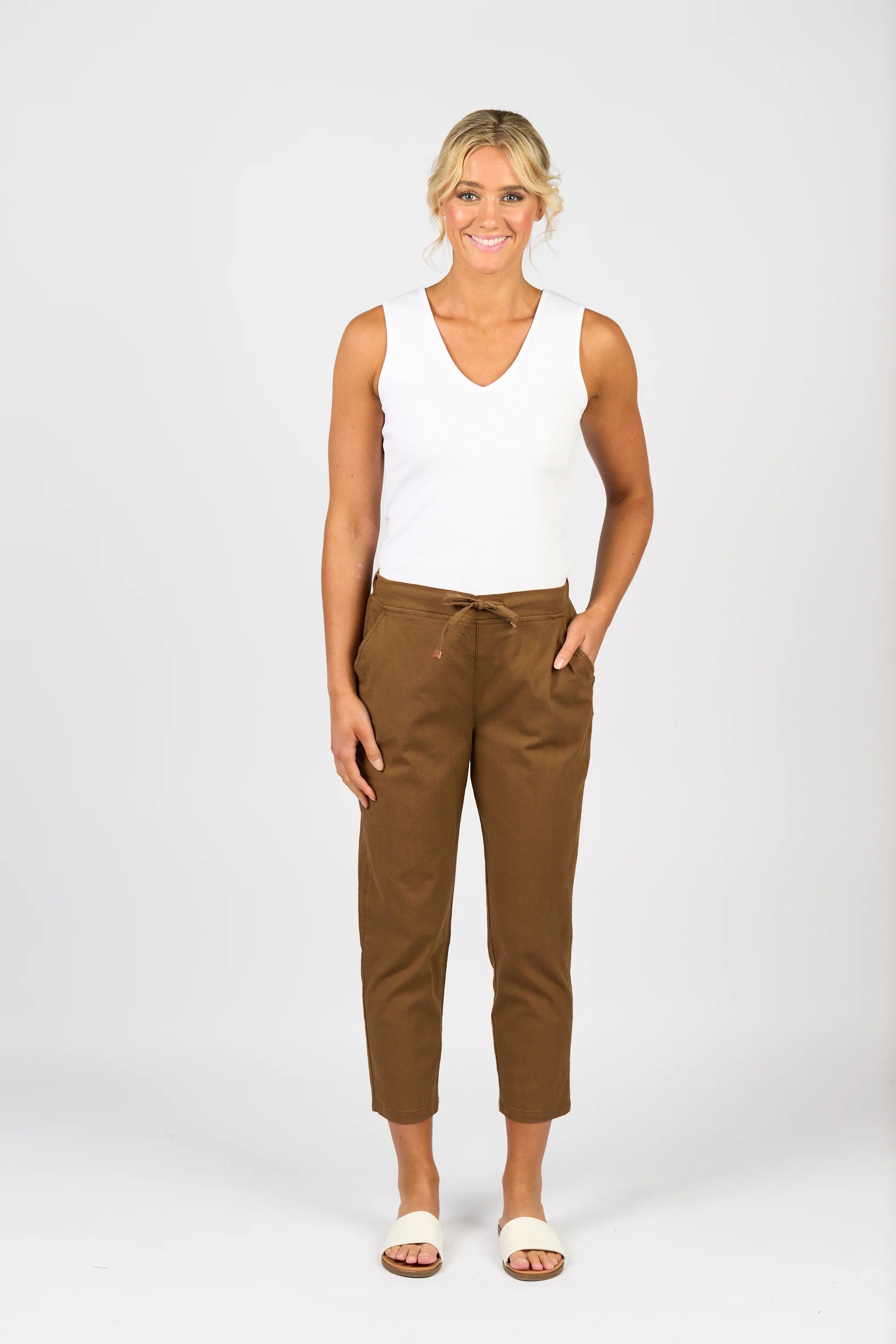 Size GuideMade from a breathable linen-viscose blend, these slim-leg ankle grazer pants are perfect for warm weather. They feature an elastic waistband with metal eyelets and a drawstring for a comfortable...